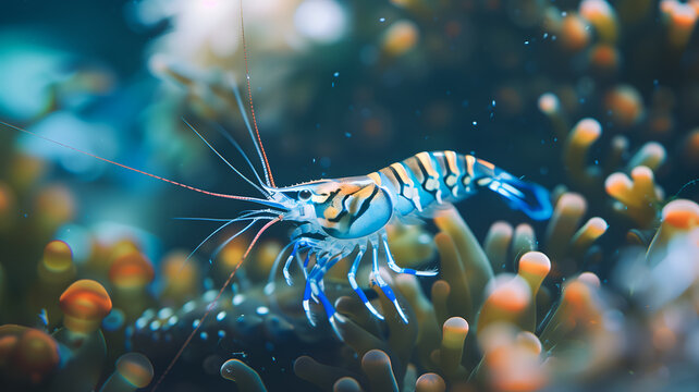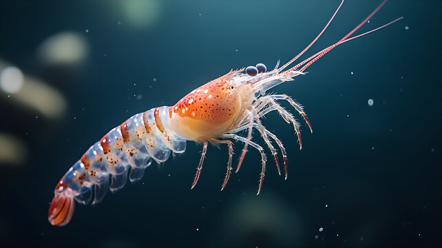 A single live shrimp suspended in water