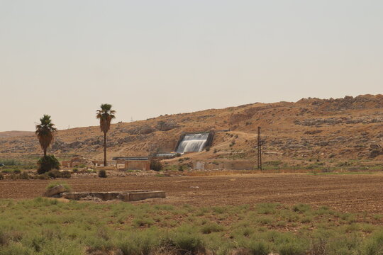 Artificial waterfall flowing through rocky desert terrain, known as Al-Kindi Waterfall near Aleppo, Syria. Designed to regulate water flow and support irrigation while enhancing the outskirts’ scenery