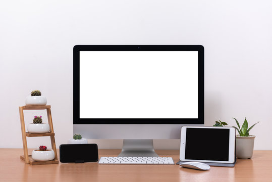 mock up front view blank screen Computer All in one with mouse, keyboard,pencils and tree vase in Modern office