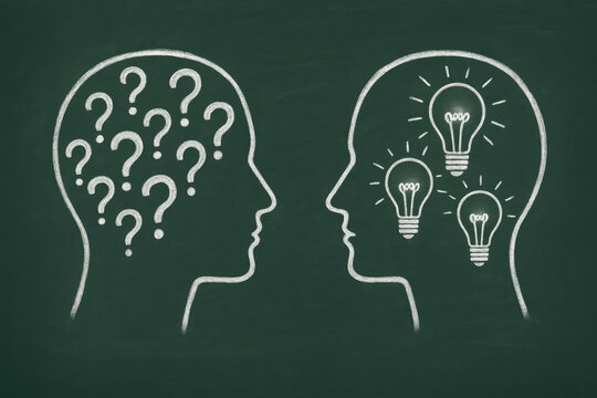 Two chalk-drawn head profiles facing each other on a green chalkboard one filled with question marks the other with lightbulbs