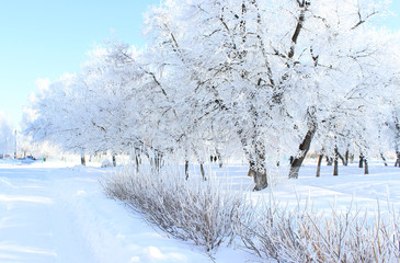 Snow-covered rural meadow with drifting snow, bare trees and rolling hills under overcast sky