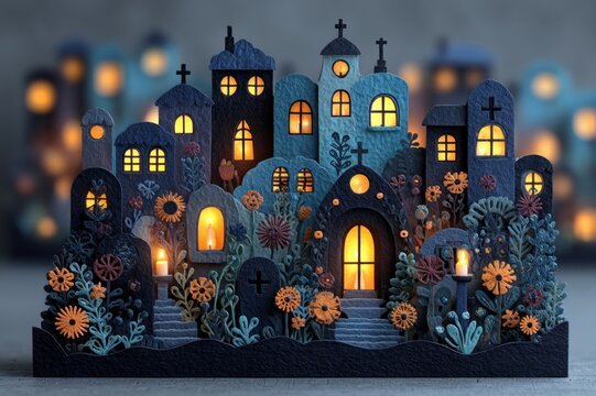 Paper cut style postcard for All Saints Day with candles, graves, and flowers