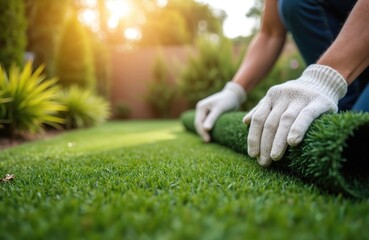 Hands in white gloves roll out synthetic grass lawn. Person installs artificial turf backyard garden. Home landscaping DIY project, creating green space.