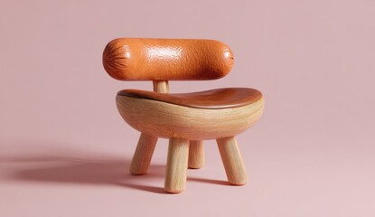 A stylized, child-sized chair, light brown wood legs, and a sausage-shaped leather back and seat