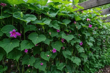 Dense growth of Akebia quinata with pink and purple male and female blossoms blooming in early spring on a shaded garden trellis