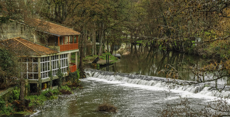 Lush landscape with willow trees and green vegetation with the Arnoia River in the village of Allariz, Orense.