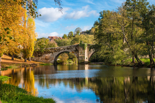 Old Romanesque stone bridge over the Arnoia river in the beautiful village of Allariz, Galicia.