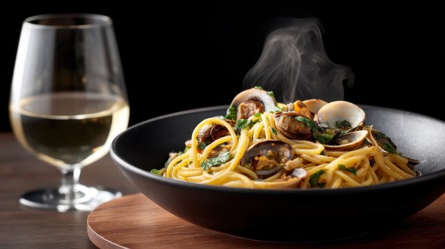 A mouthwatering plate of Italian spaghetti alle vongole, pasta with fresh clams, garlic