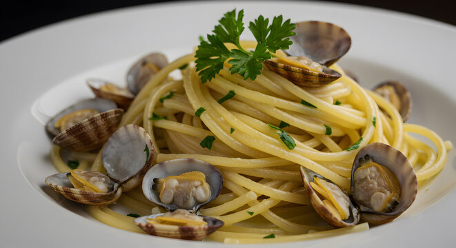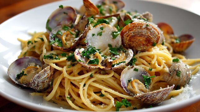 A dish of spaghetti alle vongole with clams, garlic, and parsley in a white wine sauce.