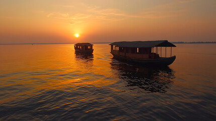 Beautiful sunset with houseboat in the backwaters of Kerala, India