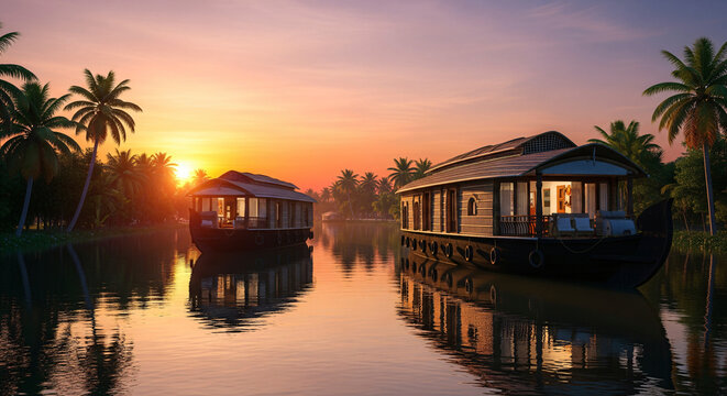 Verdant kerala backwaters mirroring emerald palms, wooden houseboats gliding across calm waters, capturing traditional landscape's peaceful essence