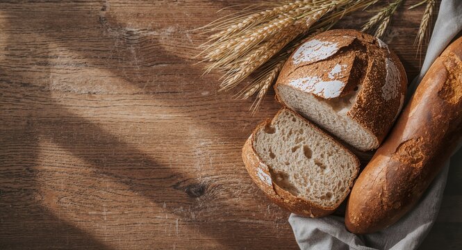Sliced fresh rye bread and crusty baguette showcasing loaf texture on a wooden table, ideal for bakery display or bread preservation
