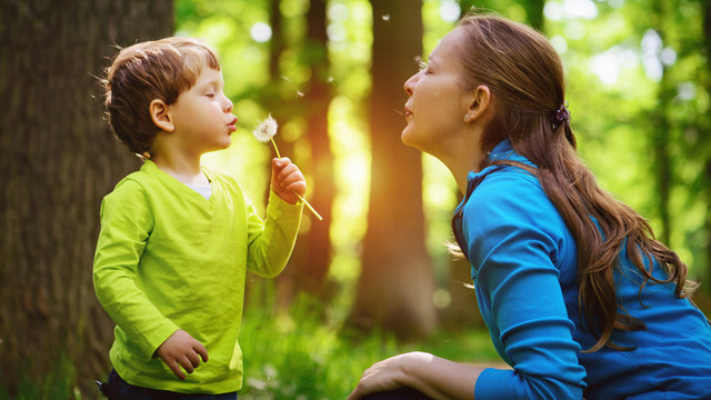 Mother and little daughter having fun in summer meadow with yellow flowers. Happy family on summer. Concept of healthy family without allergies. High quality photo.