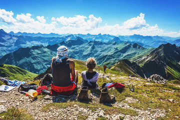 Pair of hikers resting near summit of mountain