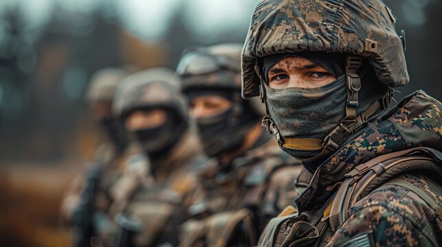 Soldiers in formation boots and camouflage in training