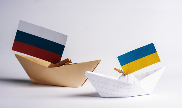paper ships with flag of of Ukraine and Kremlin star Russia, relationships war conflict between the countries occupation of the territory
