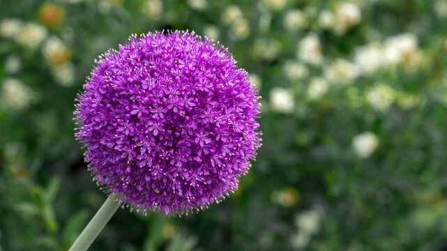 Blooming purple allium flower head with soft bokeh garden background