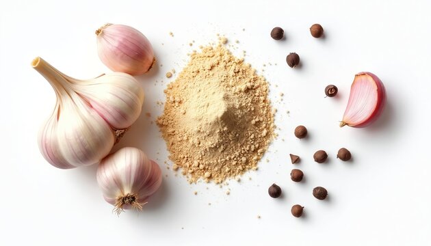 Top view displays garlic bulbs powder and pepper seeds against a white backdrop. Composition offers culinary, ideal for food blog or recipe illustration about aroma spices.
