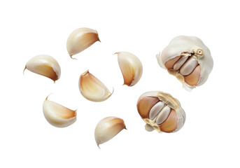 Garlic bulbs and cloves falling on a white background, ready for seasoning and flavor