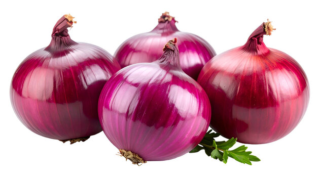 Four vibrant, round bulbs of a common vegetable, displaying a deep red outer skin. Some green leaves sit near