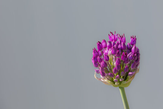 A garden leek (allium) with many buds and some first blossom in front of a gray background