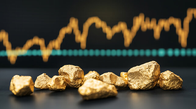 Golden nuggets glimmer against the backdrop of a fluctuating stock market graph, symbolizing wealth, investment, and the allure of financial success. Strategic asset allocation shown.
