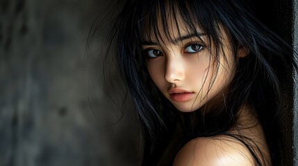 Close-up portrait of a young woman with dark hair and brown eyes, looking directly at the camera.
