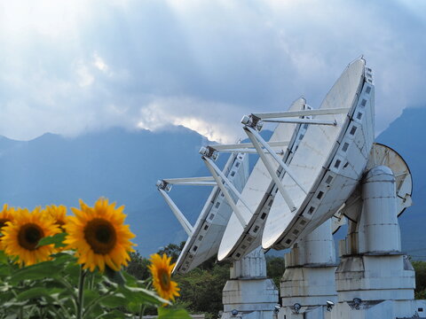 Radioteleskop Array ALMA in Chile, Atacama, Parabolantennen vor blauem Himmel mit Wolken
