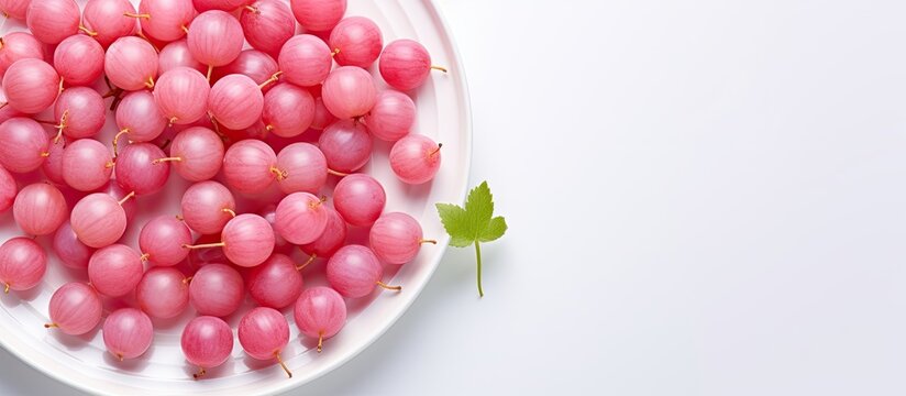 Top view of pink gooseberries on a white plate creating a vibrant copy space image for summer food with a berry harvest theme