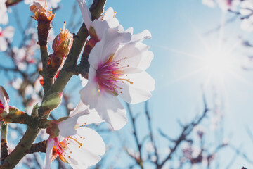 Flores de almendro en primavera, rama de almendro en flor sobre cielo azul.