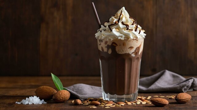 almond joy frapp coffee frapp with coconut syrup choc served aesthetically in a tall glass and wooden table