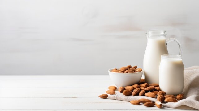 Fresh almond milk with bowl of whole almonds on polka dot cloth