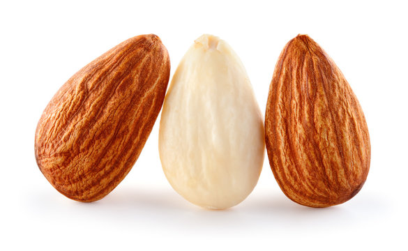 Closeup of almonds. Three nuts isolated on white background. Full depth of field.