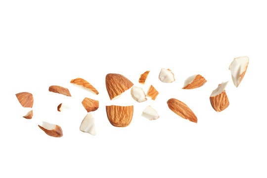 almonds baked pieces snack  and cracks Spread out  on white isolated .Clipping path -