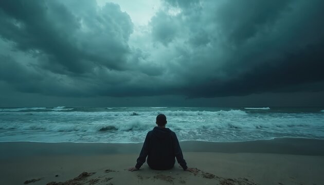 Man hiker sitting on top of a mountain with a backpack, looking at the sunset with sky and clouds background landscape
