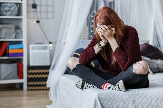 Rebellious girl crying on bed