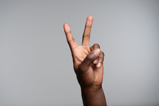 European smiling woman sitting on street stairs with legs crossed on summer day, and showing peace sign with mobile phone in hand