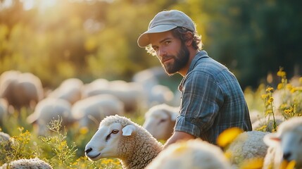 Farm sheep and feeding with man in field for agriculture sustainability and animal care Labor ecology and summer with male farmer in countryside meadow for cattle livestock and lamb pa : Generative AI