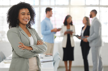 Arms crossed, meeting or portrait of happy woman for corporate career, legal aid or proud lawyer. Workplace, smile and attorney with confidence for business, justice profession and office in firm