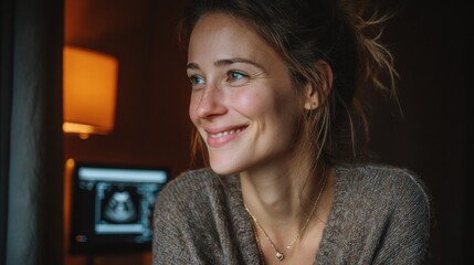 Pregnant woman smiling alone, tear in her eye, seeing ultrasound