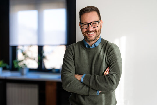 Portrait of happy success balanced man laughing, enjoys the little things in life. Happiness people