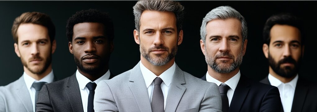 Group of men in suits and ties are standing together. They are all wearing the same color suits and ties, and they all have the same hairstyle. Concept of unity and professionalism among the group