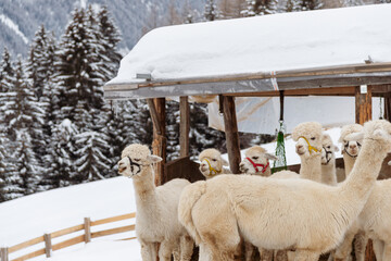 Cute alpaca wearing a festive santa hat standing in a snowy winter setting, bringing holiday joy. Ideal for sending warm wishes on greeting cards or sharing on social media