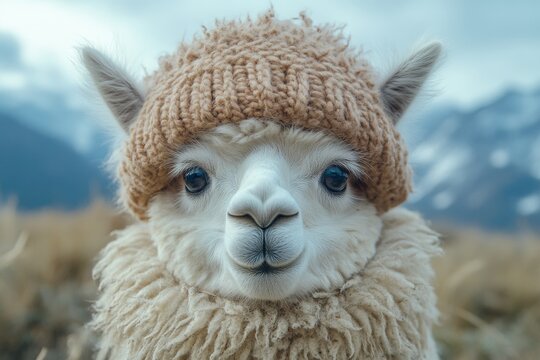 Adorable alpaca wearing a cozy knitted hat against a serene mountainous backdrop.