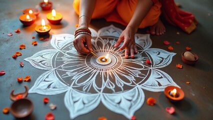 Pohela Boishakh celebrations, Colorful Sand Artist Creating Intricate alpana (traditional Bengali pattern) Design Close up View