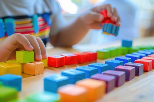 Child playing with colorful alphabet blocks, stacking them on table. Educational activity for early learning and cognitive development.