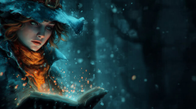 Young witch in black and blue outfit casting a spell with her magic book in a spooky forest