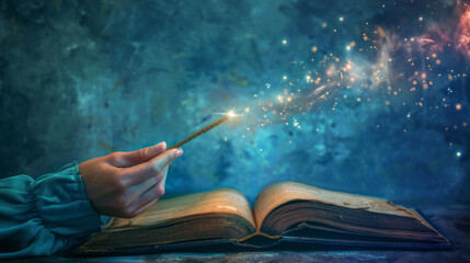 a wizard's wand over an open ancient magic spell book sparks and colored smoke emerges Halloween mystical magician sorcery occult witchcraft seance party invitation background with copy space