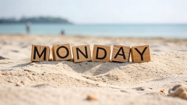 Workcation spelled with stones on a sandy beach at sunset with ocean waves
