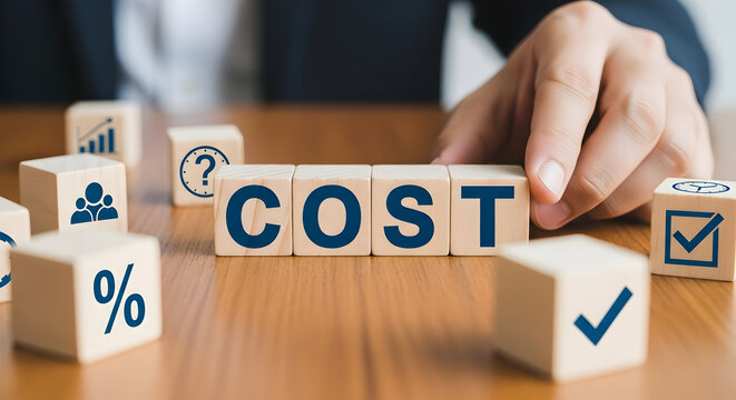 The word "COST". Issue of cost. Putting wood cubes with alphabets and icons. Top view of wood table.